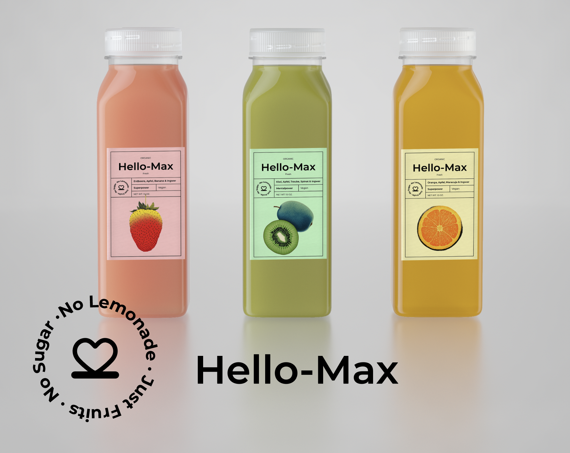 Für Hello-Max haben wir zusammen mit dem Obstbauer Winkler aus Birkingen eine pure Saft-Reihe entwickelt, die den Moment des ersten Schlucks feiert: ein frisches „Hallo“ aus Orange, Erdbeere oder Kiwi – sonnengelb, leuchtend rot und lebendig grün, ganz ohne Zucker oder Zusätze, dafür mit echtem Ingwer-Kick zum Schluss. Vom Namen bis zum Etikett erzählt das Atelier-Werk eine vegane, aufmunternde Story aus 100 % Frucht: ehrlich, frisch und gemacht, um den Tag mit einem Lächeln zu begrüßen. M – Natürlich motivierend: macht wach, leicht und gibt dem Tag einen frischen Start.
